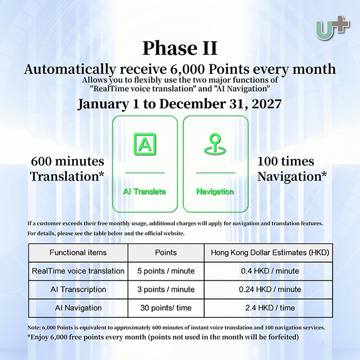 2️⃣ Phase Two (from January 1, 2027, to December 31, 2027): Automatically receive 6000 Points each month, allowing you to flexibly use the "Real-time Voice Translation" and "AI Navigation" features.