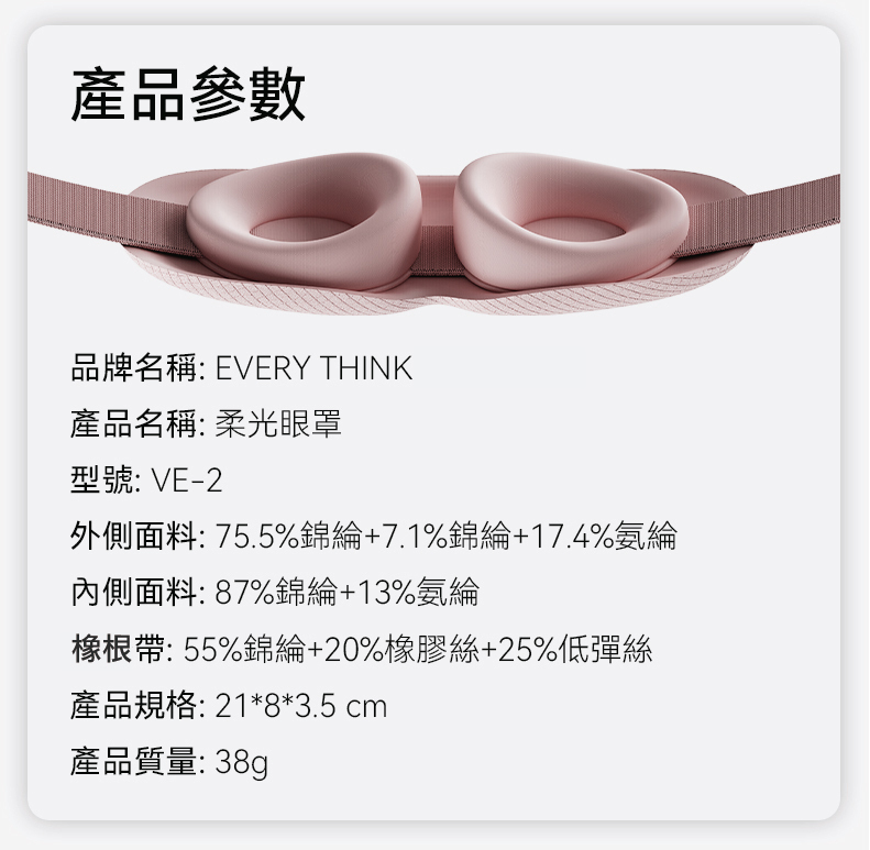 佢就係 VE2 立體柔光眼罩,VE2 採用了人體工學立體剪裁,3D設計令用家使用時不會壓迫眼球,令眼部空間更加寬闊,而且立體遮光圈更自然貼合眼部曲線,加上遮光圈可左右調節,適合不同用家臉型,做到多角度防光線滲透,達到99.9% 超強遮光.