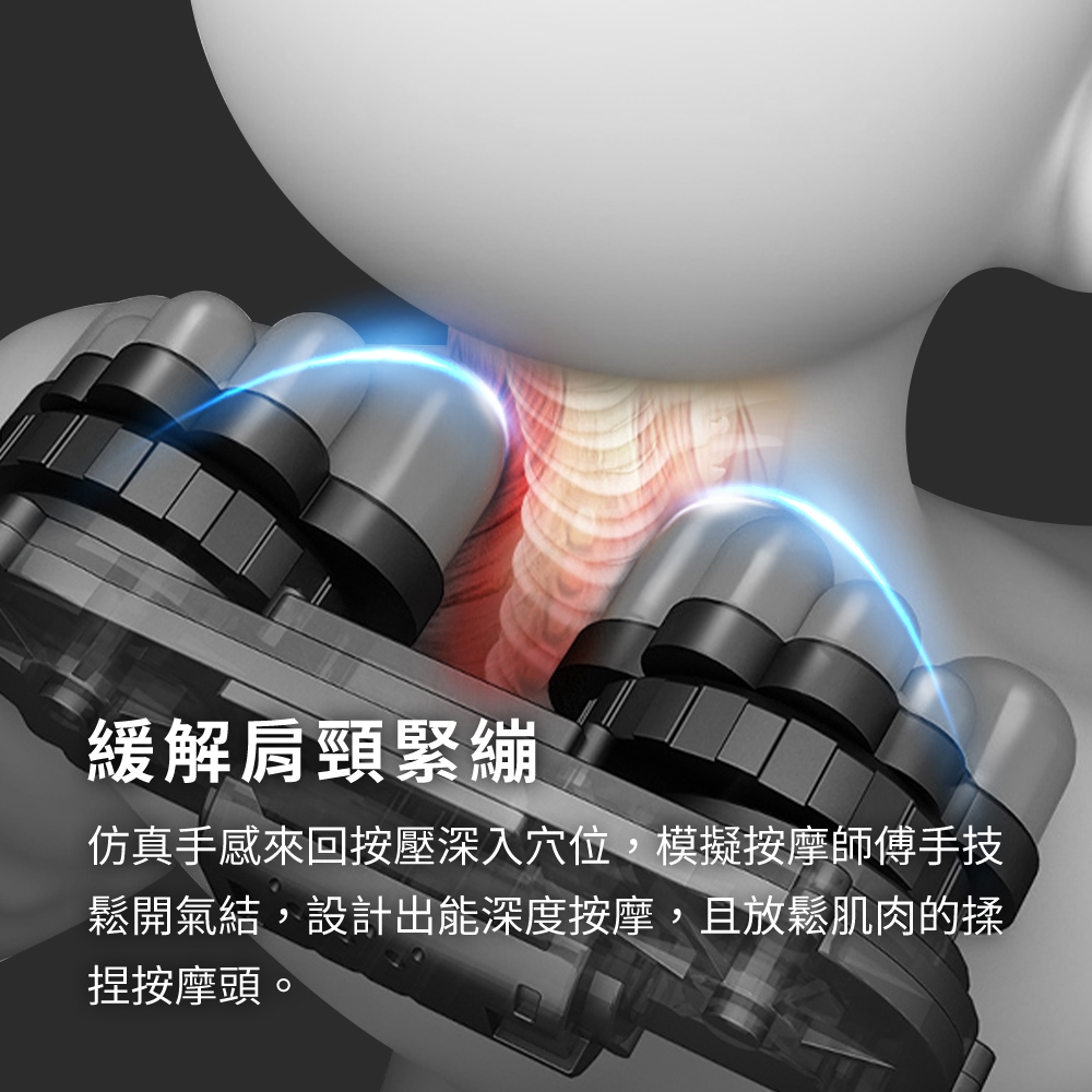 仿真手感來回按壓深入穴位,模擬按摩師傅手技鬆開氣結,設計出能深度按摩,且放鬆肌肉的揉捏按摩頭。