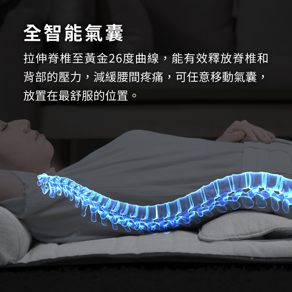 拉伸脊椎至黃金26度曲線,能有效釋放脊椎和背部的壓力,減緩腰間疼痛,可任意移動氣囊,放置在最舒服的位置。