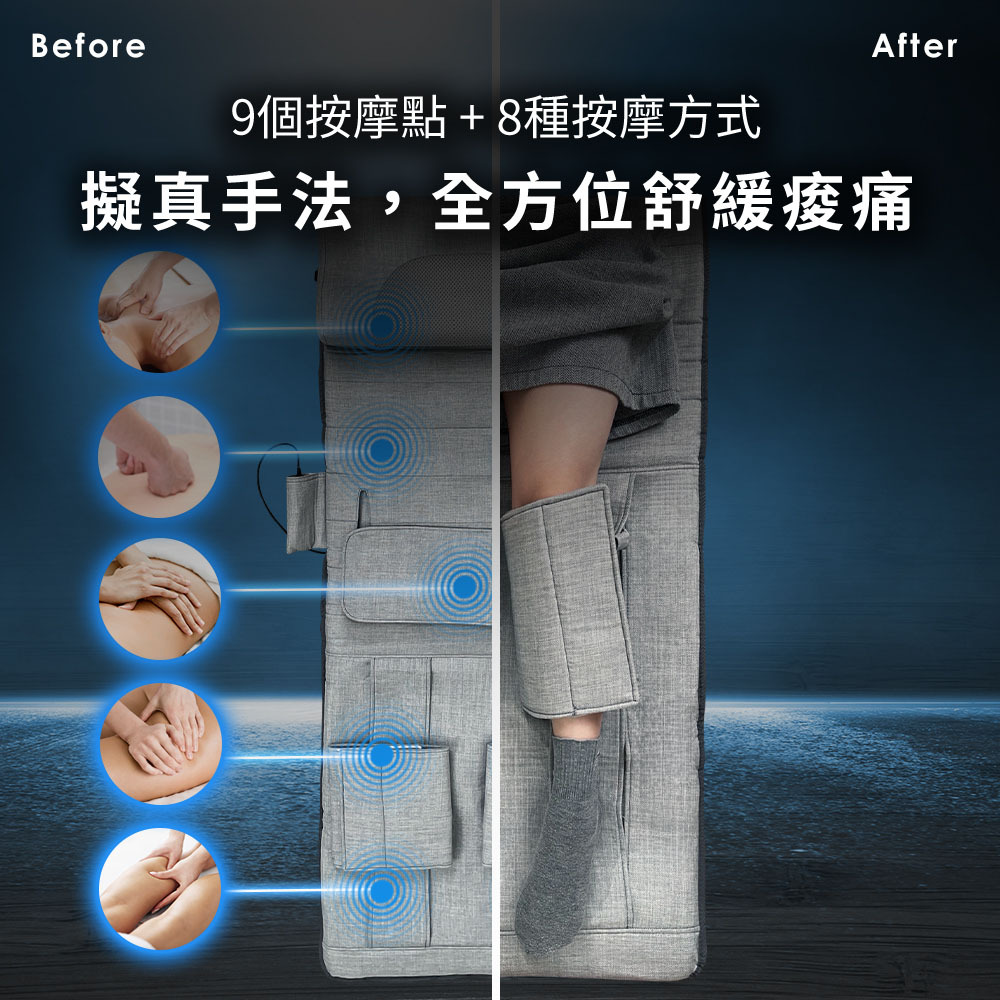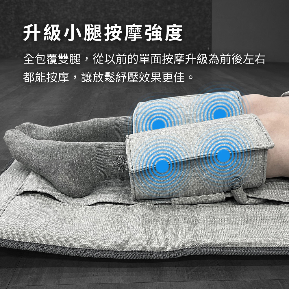 全包覆雙腿,從以前的單面按摩升級為前後左右都能按摩,讓放鬆紓壓效果更佳。