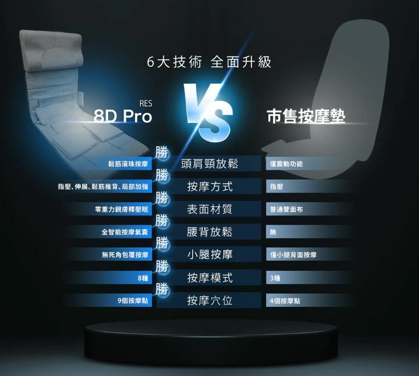 Future Lab 將按摩椅既技術完美移植到8D Pro極手感按摩墊上.只須要細小的空間,用家無論坐著,躺著都可以享受擬彷如按摩椅人手按摩既舒爽感覺.而且按摩墊有8種按摩模式9個按摩點,無論肩頸/腰背/小腿都完美覆蓋.而更為重要既係按摩墊,只要輕輕對摺就可以收納在狹小的空間,真係香港用家既恩物呀!