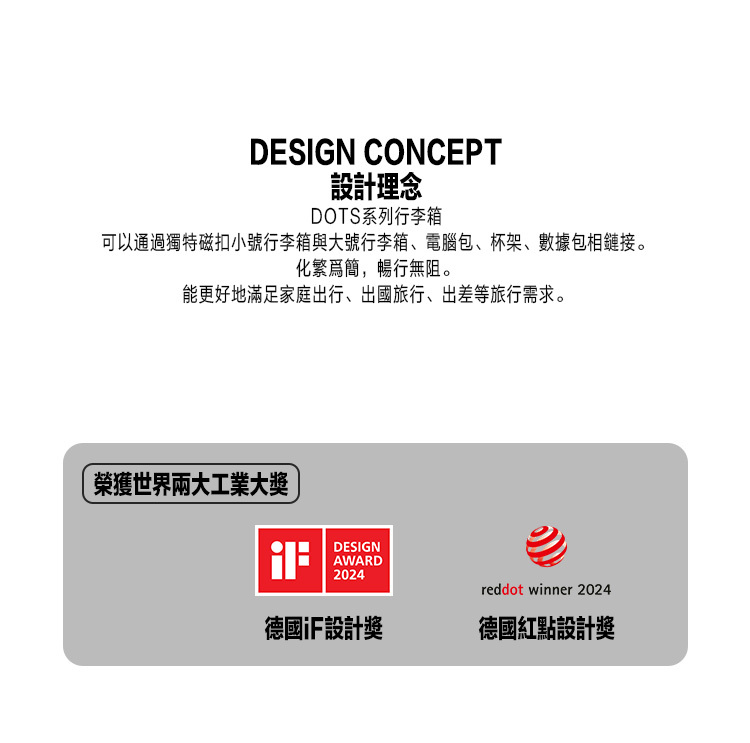 繼 Pebble 摺疊系列後,Jollying 再次發揮創意推出 Dots 系列 - 設計得到 2024德國IF獎、紅點獎的認可 - 以獨特磁扣將大小行李箱相連,一手即可輕鬆拖著兩件行李,免卻手忙腳亂。