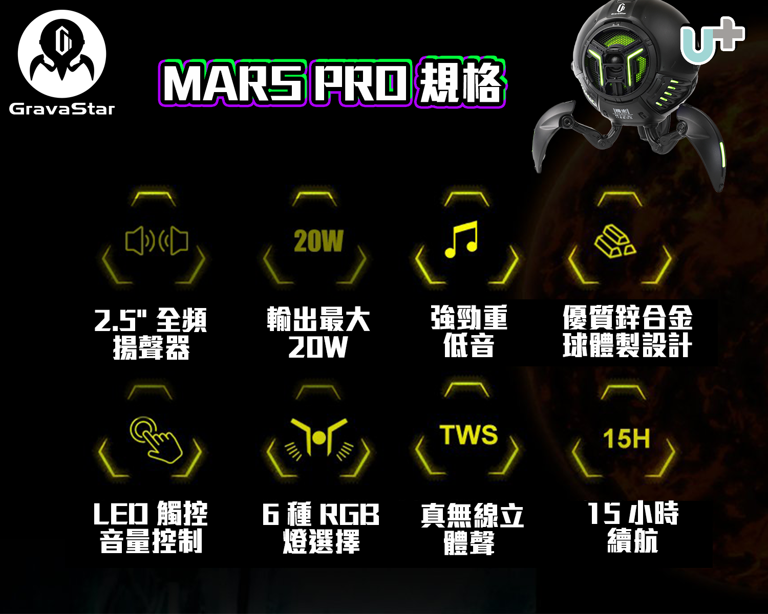 Mars Pro☄️的外型仿如科幻電影裡的智能機械人。鋅合金的外殼懸掛設計,給予它最堅硬的外殼保證了音箱的穩定性,讓聲波在空間內產生共鳴。Mars Pro似是未來浩瀚的宇宙裡被傳遞到地球的重力智能機械人,帶你探索前所未有的音樂體驗。持久續航長達 15 小時播放音樂,把你沉醉於遊戲🎮,音樂🎶,電影🎞️和派對中。