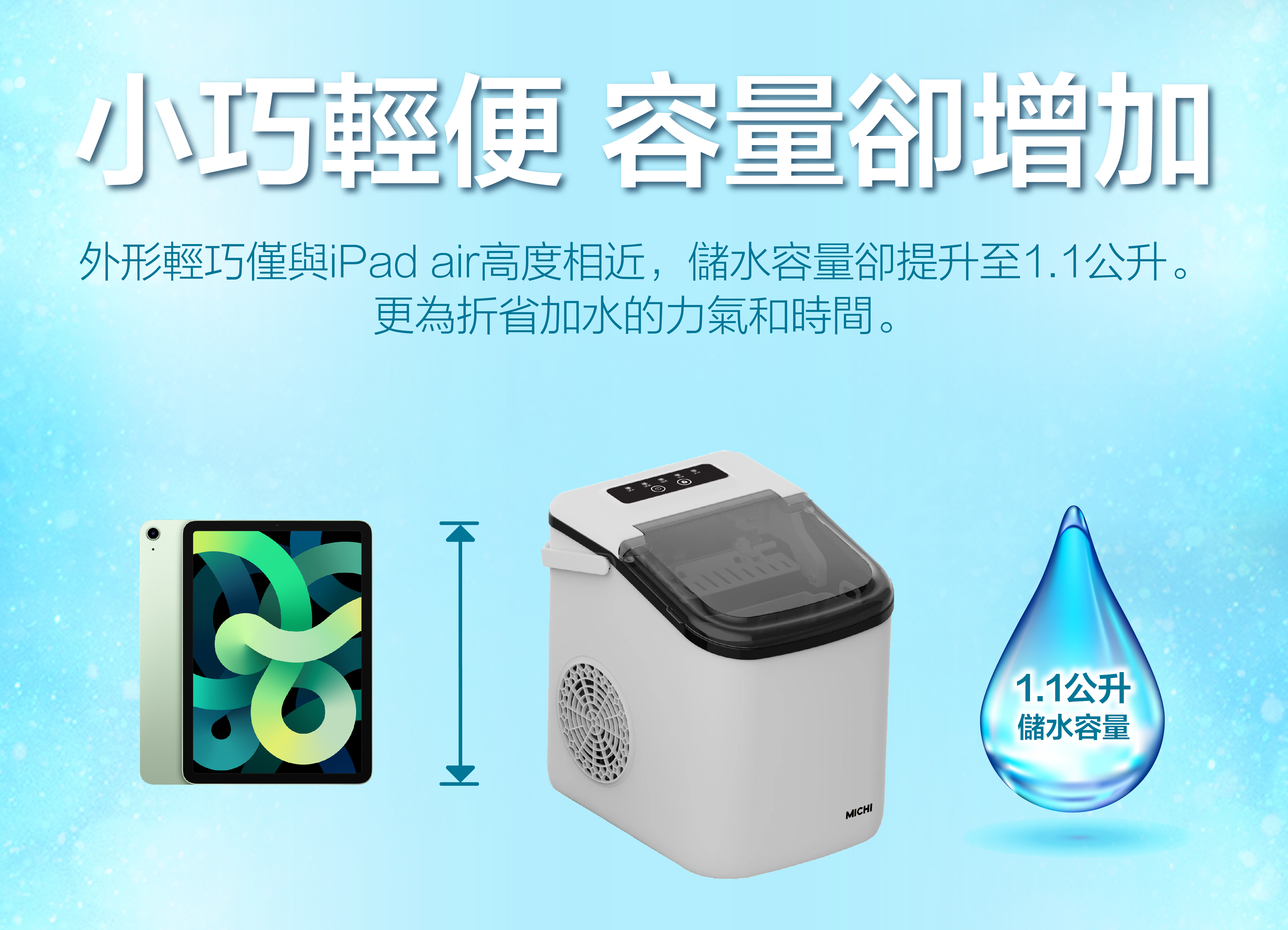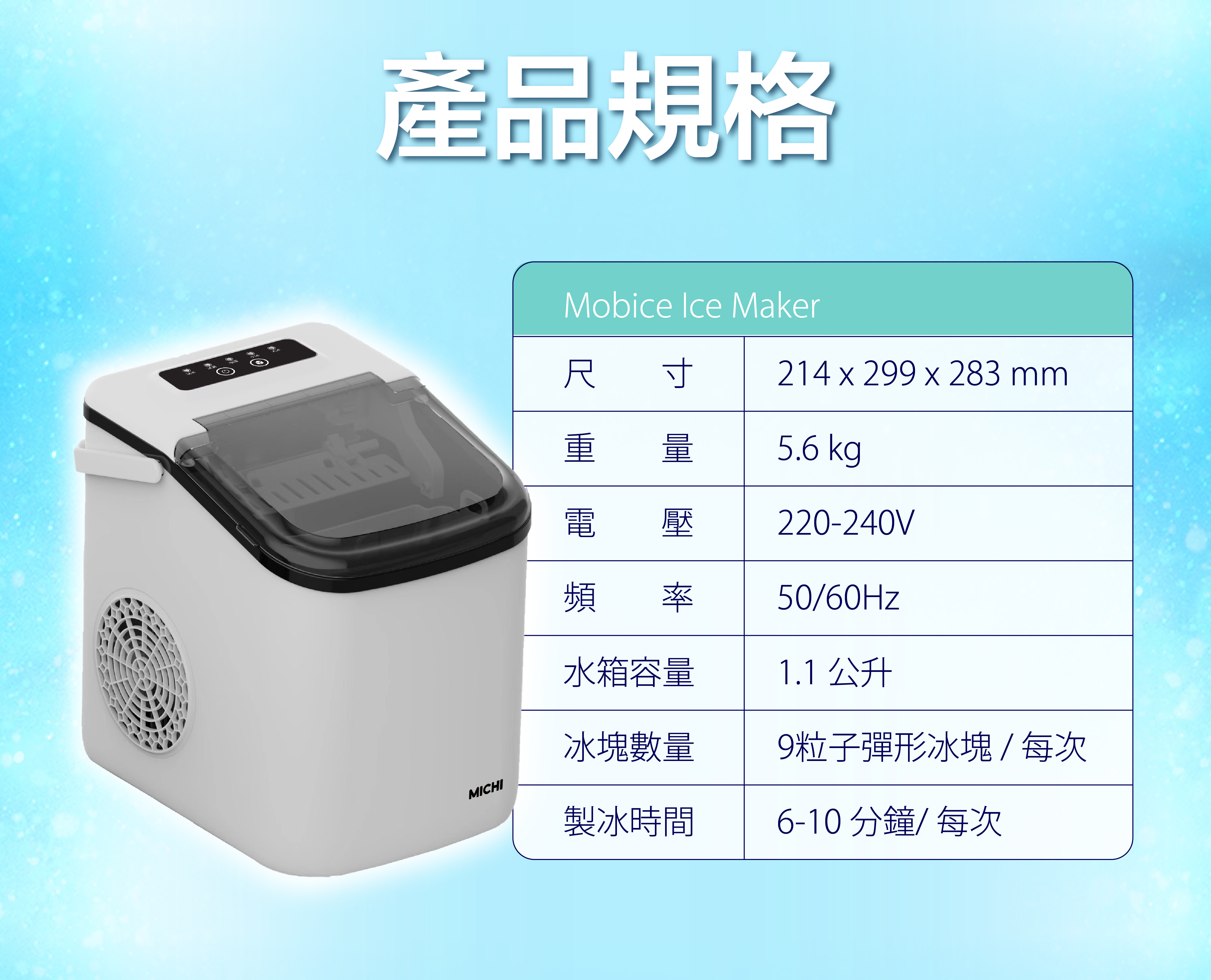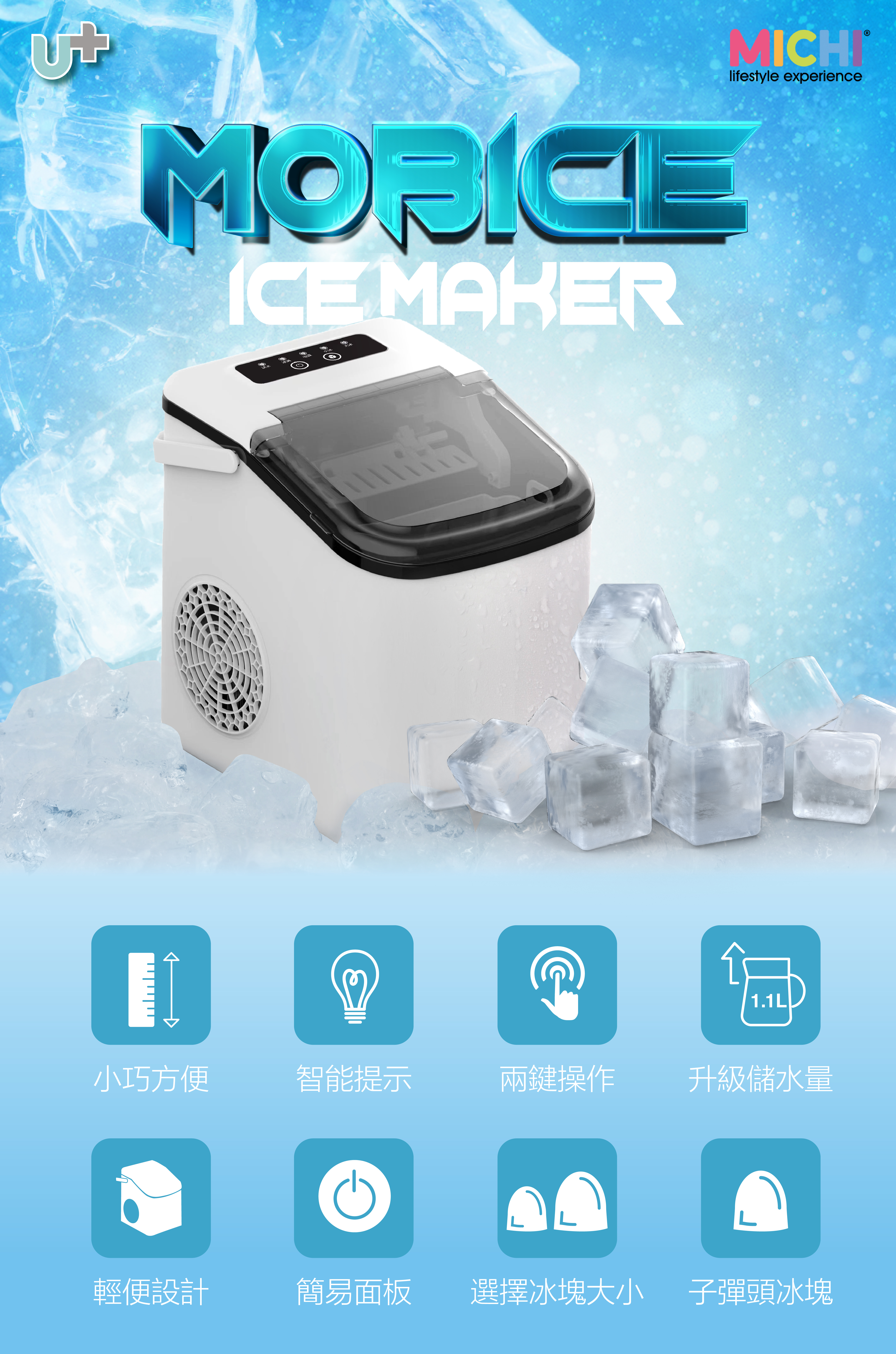 黎到第三代的家用制冰機,MICHI 繼續為大家喺呢個炎炎夏日帶來清爽冰涼既Moment!用傳統雪櫃制作冰塊的缺點就唔多介紹了,(唔衛生,速度慢,有細菌等等數之不盡),MICHI Mobice 可為你完全解決以上問題,新一代設計比往年更加小巧,高度同Apple iPad air 相約,但功能不變,依然做到極速 6分鐘 出到 9粒既冰塊,更加可以隨你喜好,調節大小.