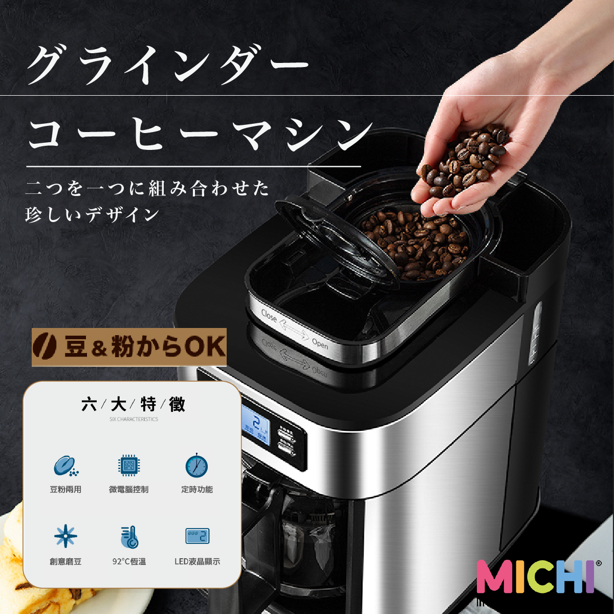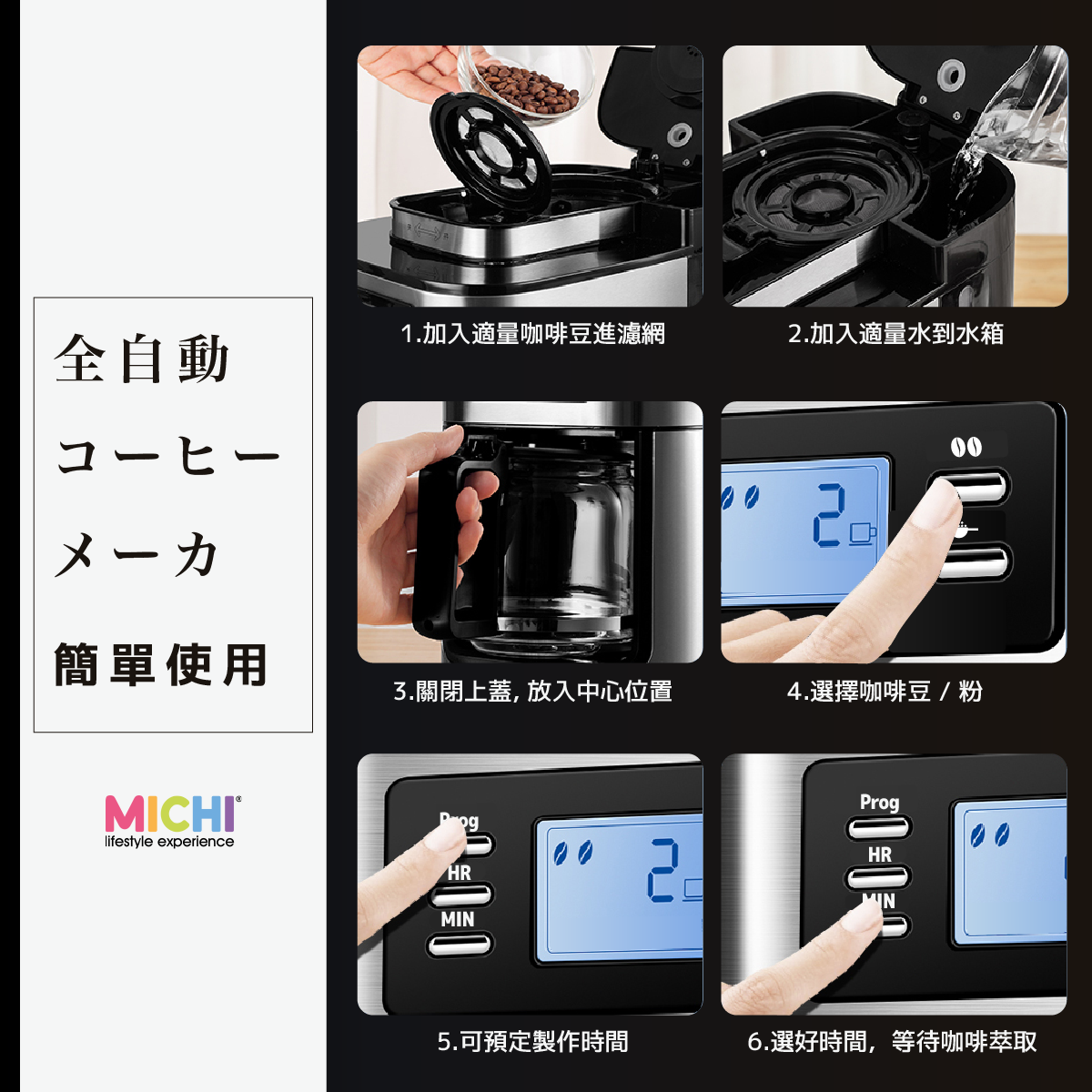 香港品牌🇭🇰| 香港行貨🇭🇰最長15個月保養😎本地原創品牌為你帶來簡約的生活享受💪🏻🇭🇰Michi Off Café☕全自動磨豆沖粉雙用式咖啡機 🫘一日之始,由歎一杯靚咖啡開始☕,據香港咖啡協會調查顯示📊,香港人特別鐘意飲咖啡,每人1年平均飲50杯咖啡🥤, 喝咖啡已經成為不少香港人生活的一部分.本地原創品牌有見及此👀,推出Off Cafe全自動磨豆沖粉雙用式咖啡機🙌🏻, 適合所有鐘意飲咖啡但又不滿意即溶咖啡嘅朋友🙋🏻‍♂。磨粉機和咖啡機嘅兩為一體.更加可以慳番每日$40💵 1杯既咖啡錢🥤, 幫你喺屋企都可以享受即磨咖啡嘅奢侈😌,在家嘅高級Cafe享受,仲可以自由配搭牛奶🥛/冰🧊,調配出 冰凍咖啡/美式咖啡/奶泡咖啡🥤.用法非常簡單 💁🏻‍♀⿡) 加入適量既咖啡豆/咖啡粉⿢) 加入適量水份(最多可以盛載1.2L)到水箱⿣) 關閉上蓋,將咖啡壺放到中心位置⿤) 選擇模式 磨豆或磨粉 模式⿥) 預定製作時間⿦) 大概90秒時間,就可沖泡出喜愛的咖啡⭐主要功能-市埸少有的磨豆沖粉兩用的家用咖啡機-彷手工研磨,提煉咖啡精華-不鏽鋼機身,耐用防花-自動92℃保溫功能,最長可達2小時-定時沖泡功能-LED 液晶顯示, 簡單顯示,一鍵操作- 電子控溫技術,保持沖泡咖啡水溫的穩定-防滴漏設計- 可拆式濾網方便清洗📏產品呎吋27.7 x 19.8 x 30.2 cm重量3 Kg