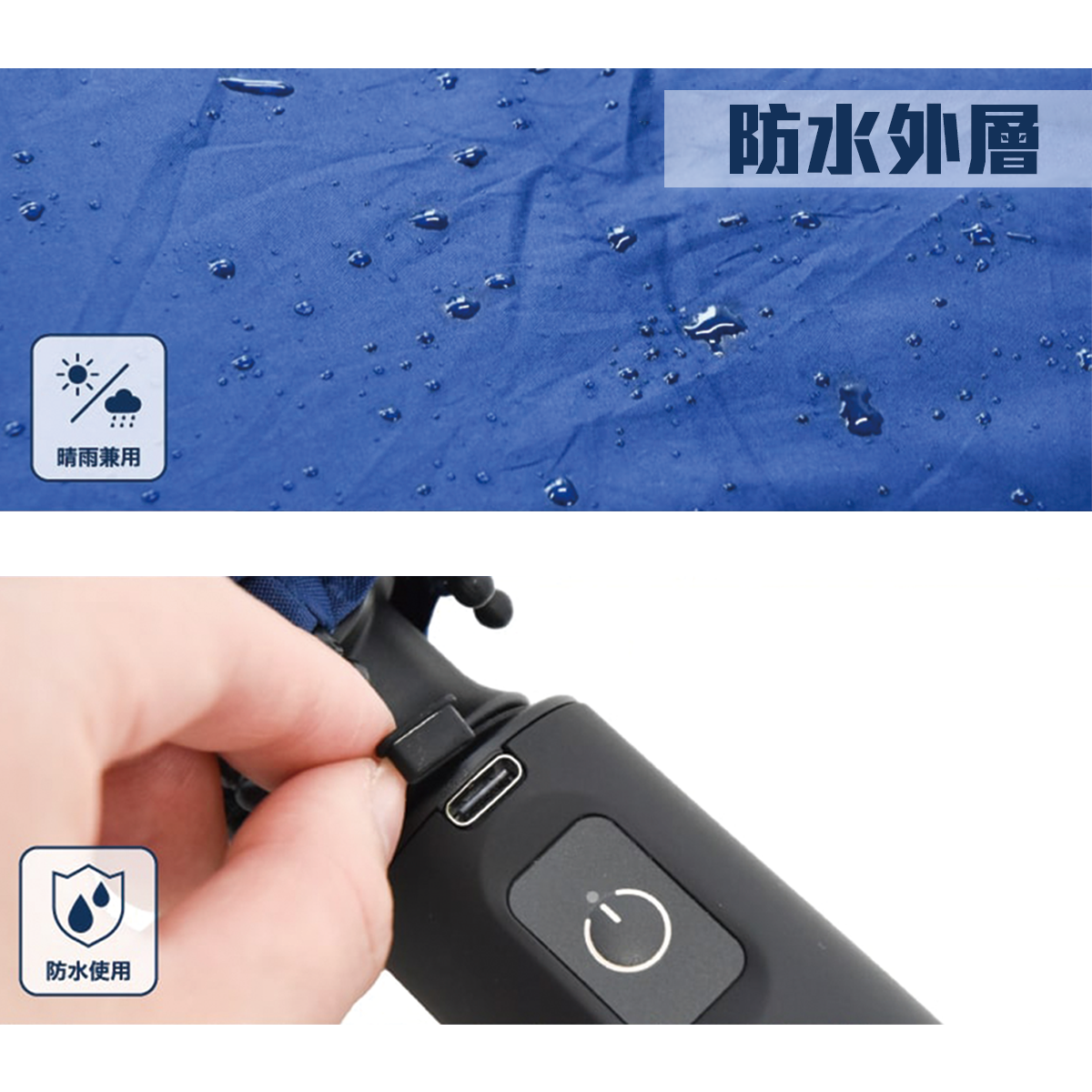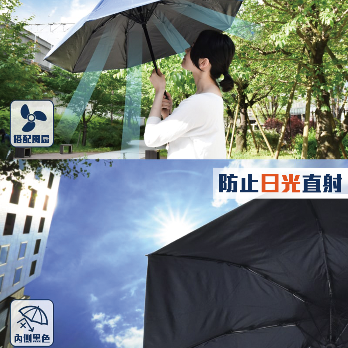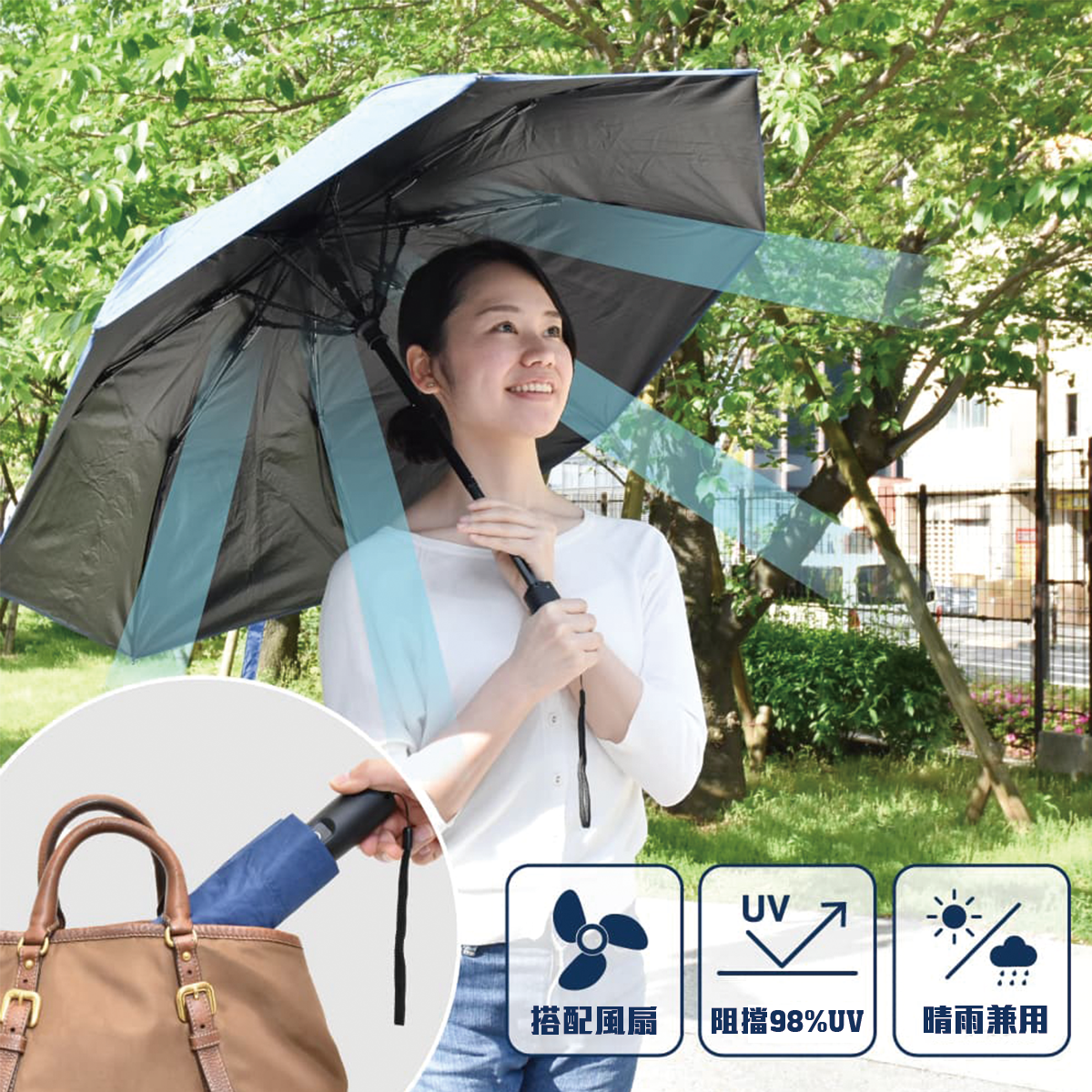 Fan + Umbrella = 撥水機能性風扇雨傘,Fanbrella 可以為你遮風擋雨之外,仲可以吹住涼風防曬,傘布採用防水性極佳嘅滌綸工藝,撥雨功能無得彈,防曬塗層更加能夠阻擋98% 嘅紫外線,防UV一流。採用黑色內側,能夠避免地面陽光反射,細心之選。 加埋玻璃纖維嘅遮骨,韌性勁,擋風擋雨都no problem啦‼
